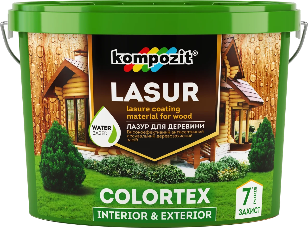 Kompozit лазурь Colortex — високоефективний антисептичний лесуючий засіб, 100% акрилова лазур для декоративного оброблення та тривалого захисту деревини від забруднень, руйнування і старіння під дією води, УФ-випромінювання та широкого спектра біологічних пошкоджень. Надає приємного забарвлення деревині, підкреслює її природну текстуру та малюнок. Містить водовідштовхувальний віск, УФ-фільтр і транспарентні пігменти.